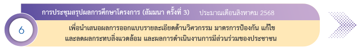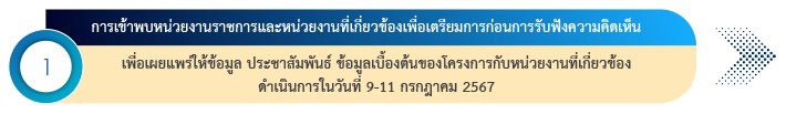 เพื่อให้ผู้มีส่วนได้ส่วนเสียได้รับรู้ และเข้าใจโครงการ และให้ทุกภาคส่วนที่เกี่ยวข้องได้มีส่วนร่วมในการให้ข้อมูล แสดงความคิดเห็นและให้ข้อเสนอแนะต่อโครงการ ประกอบด้วยกิจกรรมสำคัญๆ เรียงตามลำดับ ดังนี้